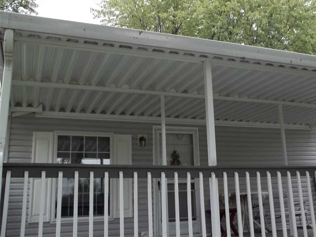 The latest design offered in the industry today! Eliminates nesting of birds and other pests, and offers a beautiful, all-aluminum ceiling area. Features a 6", easy to clean gutter system, heavy-duty posts and beams, and custom manufacturing to any size. Satisfaction guaranteed with a 25 year factory warranty!